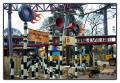 Rita's ride photo booth and shop, which now seems to be complete. The "race track in Ug Land" theme is achieved by mixing the prehistoric leopardskin look and the chequered poles. |