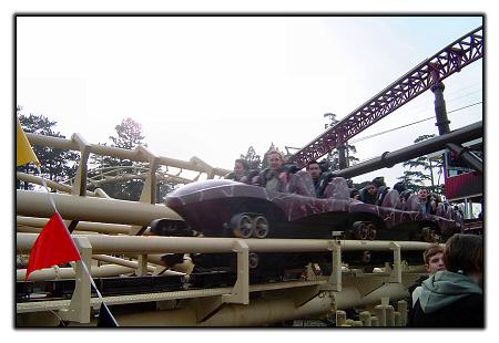 One of Corkscrew's trains in the brake run. Riders really get a great view of Rita as it speeds above them.