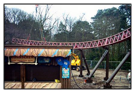 The banked turn that goes around Corkscrew's on-ride photo booth is now in place.