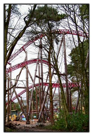 A look at the point where the three sections of track cross over each other. It also shows how large the ride will be at its tallest point.