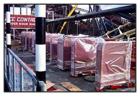Work is continuing on the ride's station platform. These objects seem to be the loading bays.