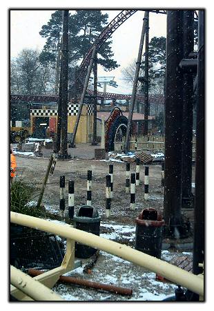 | From Corkscrew, we take a look across at Rita's hydraulics shed, along with the "tyre" entrance sign, and the posts marking out Rita's queue line. |
