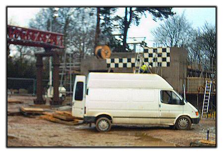 Theming work has begun! In this photo, you can see that a chequered flag pattern is being applied to the side of the launch hydraulics building.