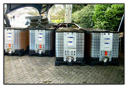 These reservoirs, currently stored in Fountain Square, are full of hydraulic oil.