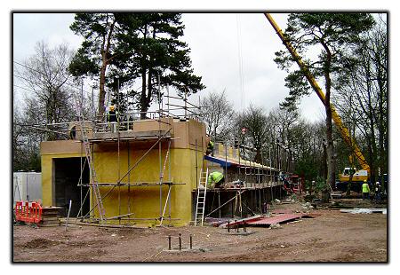 A closer look at the yellow hydraulics building. It currently has no roof to allow the larger and heavier components to be lowered in by crane.