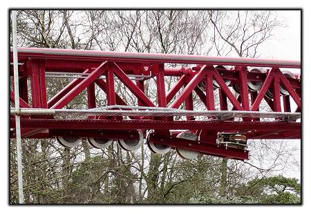 A close-up of part of the launch mechanism, near where the track passes over the hydraulics building.