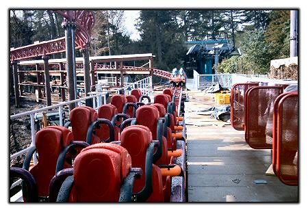On the platform, we take a look at the two Intamin Rocket trains. Note the Sky Ride station in the background.