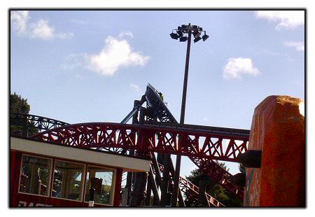 If you look closely, you can see a worker on a "cherry picker", at the top of the first airtime hill.