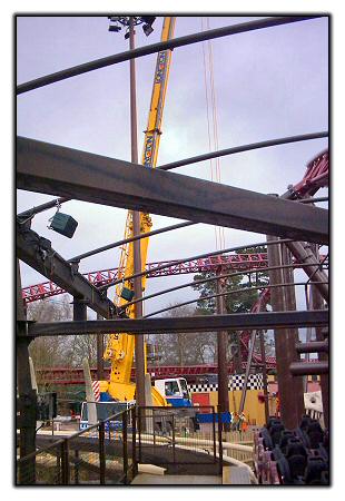 A large crane lifted the food stall into place. It was then used to put the canopy back on Corkscrew's station.