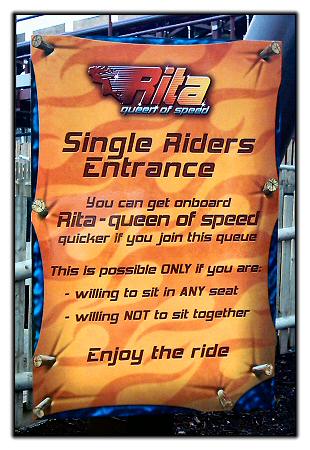The restrictions sign next to the entrance of Rita's Single Rider Queue (SRQ).