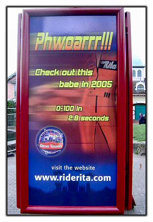 | This poster appears at the bottom of Towers Street. It has the slogan "Phwoarrr!!!", and informs the public of how fast the new ride will be. It also advertises the park's website for the new ride. |